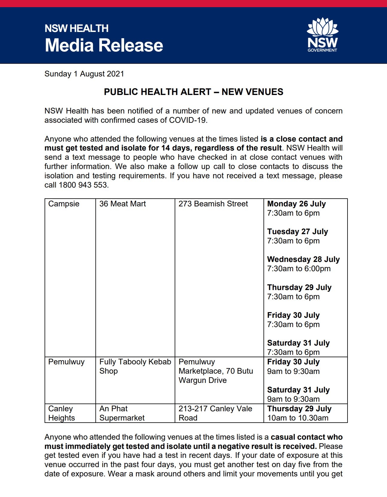 Nsw Health On Twitter Public Health Alert New Venues Nsw Health Has Been Notified Of A Number Of New And Updated Venues Of Concern Associated With Confirmed Cases Of Covid 19